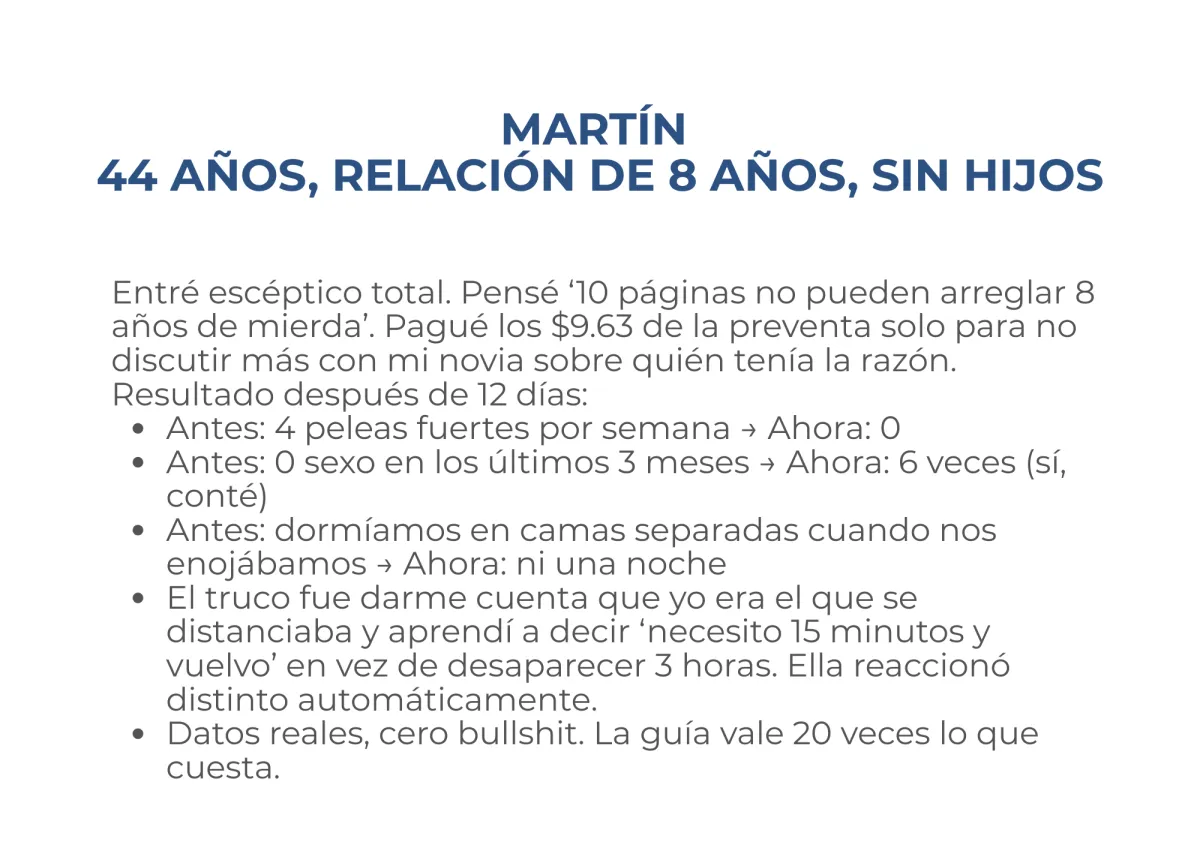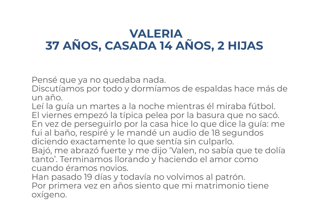 Sirve incluso mejor. El patrón está congelando lo que aún queda de cariño. Cuando lo rompes, el afecto y la atracción suelen volver en semanas porque la tensión era lo que los tenía “apagados”. Muchos dicen que volvieron a sentir mariposas después de meses o años sin nada.